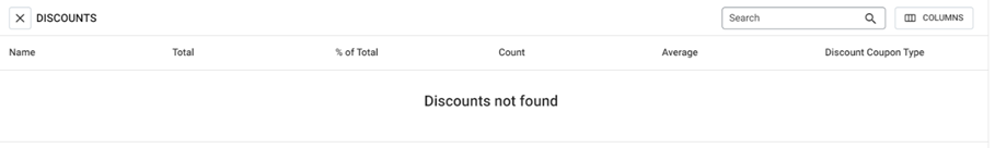 The discount table contains the columns such as Discount Name, Total, %Total, Count, Average, Discount Coupon Type, Total Receipts, % of Receipts Discounted, Gross Sales, % Discount of Gross Sales, Receipts Discounted along with Search and Column option will appear based on the selected time period.