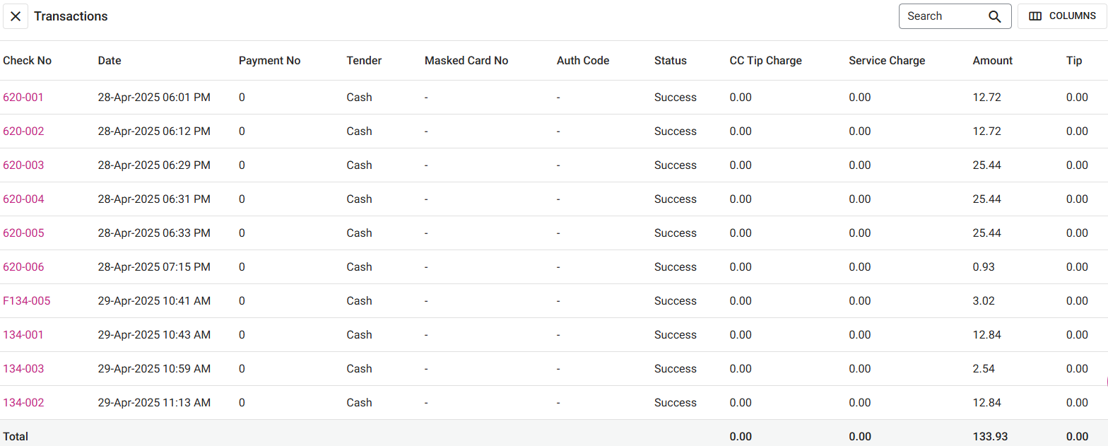 Contains columns for Check No, Date, Payment No., Tender, Masked Card No, Auth Code, Status, CC Tip Charge, Service Charge, Amount, and Tip.
