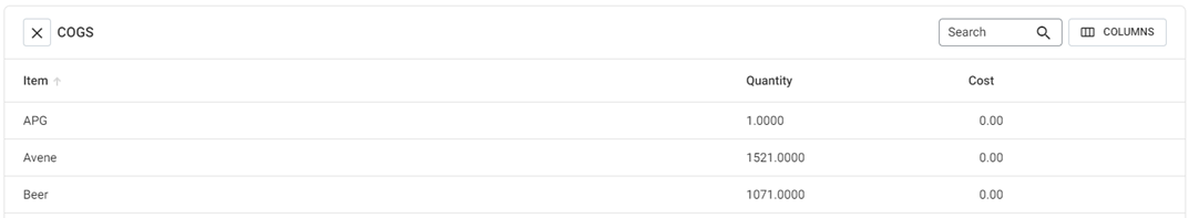 - The COGS table contains the columns such as Item, Quantity, Cost along with Search and Column option appear based on the selected Time Period.