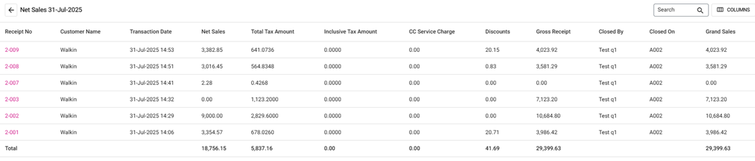 - When any value in the Receipt No column is clicked a drill down table appears for the single Receipt. It contains sections for Receipt Summary, Order Summary, Tax Summary, and Payment Summary.