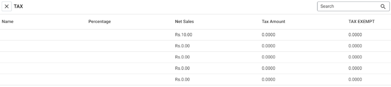 Contains columns for Tax Name, Tax Percentage, Net Sales, Tax Amount and Tax Exempt – along with Total amounts for Tax Amount and Tax Exempt.