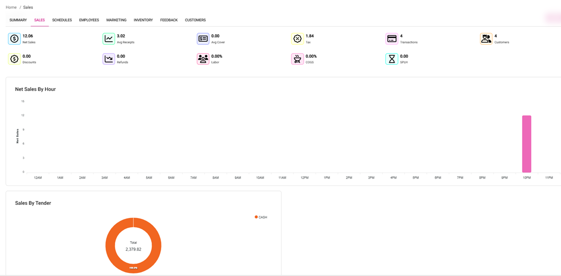 - When clicked on the COGS tiles, you will be able to view the Table, Net Sale by Hour graph, Sales by Service Type and Sales by Tender graphs appear below.