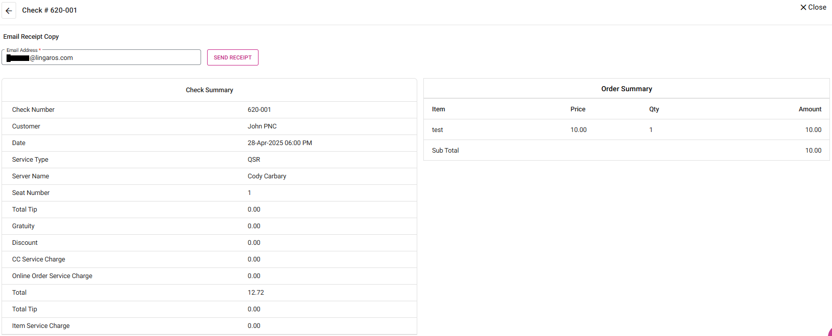 When any Check No value is clicked on, a Check# page appears. It includes Summary sections for the Check, Order, Tax, and Payment. You can email the Customer a copy of their receipt by entering their Email Address then clicking the SEND RECEIPT button.