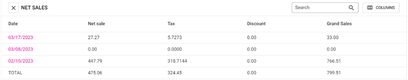 Contains columns for Date, Net Sale, Tax, Discount, and Grand Sale.