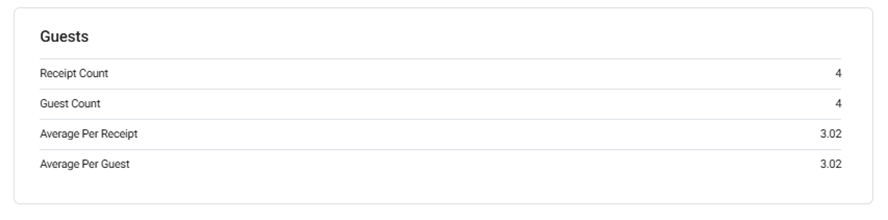 Guest Count: The total number of Guests during the selected Time Period. It will appear only when Guest/Receipt toggle is enabled in Report Settings.