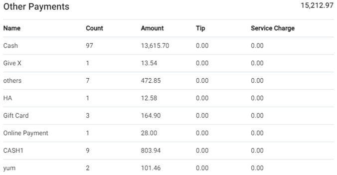 Payments other than Credit Card (such as HA, GiveX, Loyalty, Cash, Gift Card, etc.) will appear here – with the Total at the top. Includes the following columns: