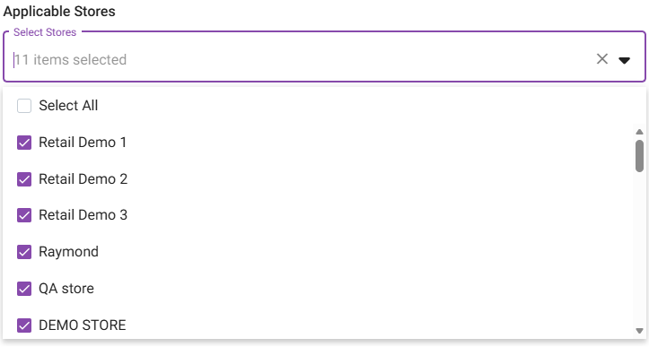 For Applicable Stores, select the Stores that this Plan can apply to (or Select All). If more than 10 stores are selected, the message '[number] items selected' appears at the dropdown header.