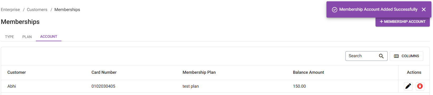 The Account tab displays a table of Customers with a Membership account on file, with columns for Customer, Card Number, Membership Plan, Balance Account, and Actions for Edit (pencil) and Delete (trash can). Also, the + Membership Account button appears at the upper-right.