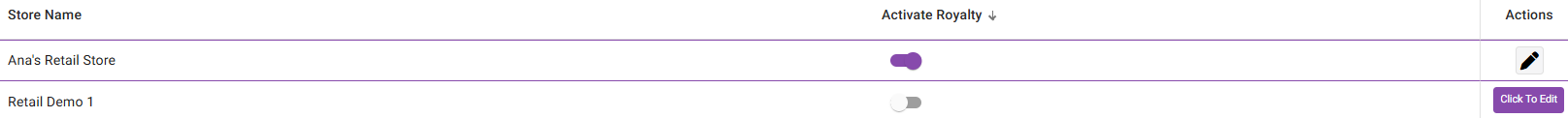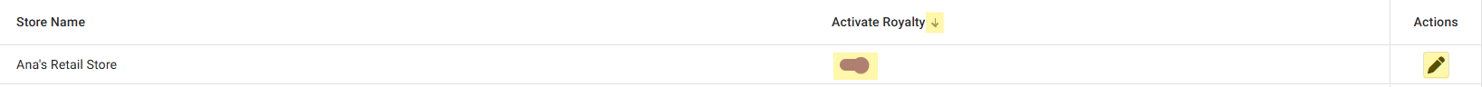 - To Update an existing Royalty: identify a Store with an existing Royalty to update, then under Actions click the pencil icon (Edit).