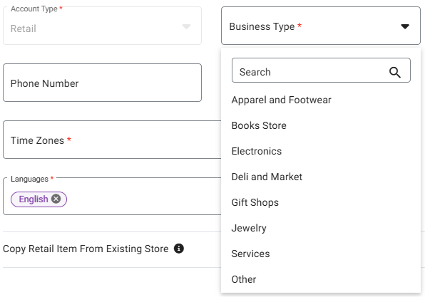 - Select the Account Type from the dropdown (it may already be locked to Retail), then select the Business Type from the dropdowns (options are based upon the Account Type selection).