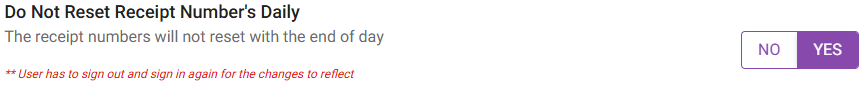 Do Not Reset Receipt Number’s Daily - If Enabled (YES), the receipt numbers will NOT reset at the end of the day. If Disabled (NO), they WILL reset at the end of the day. Any changes will reflect when you sign out then in again on EACH terminal.