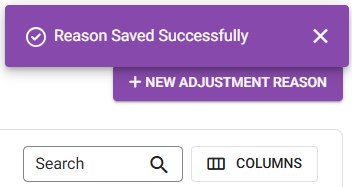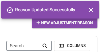 When ready, click Save or Update at the bottom-right (all mandatory fields must be filled in). You are returned to the main Adjust Inventory Reasons page, the ‘Reason Saved/Updated Successfully’ pop-up appears.