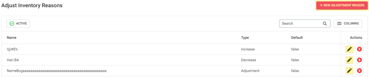 The Adjust Inventory Reasons screen appears, with the created Reasons appearing in table format containing the following columns: