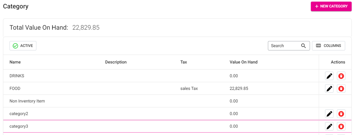 The Category page appears, including the Total Value on Hand, along with a table containing the existing Categories containing with the following columns: