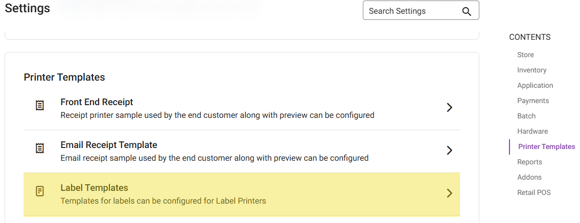 Navigation: Log into the Back Office for your Retail Store. On the left-side Navigation Panel, click Settings. On the Settings page, under Printer Templates, select Label Templates.