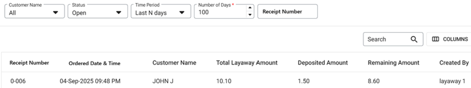 The Layaway tab displays all Layaway receipts. You can search for a Layaway receipt by the Receipt Number. The displayed table contains the following columns: Customer - The name of the customer attached to the receipt. Receipt Number - Receipt ...
