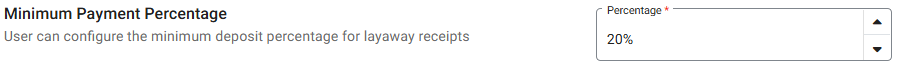 Minimum Payment Percentage - The minimum deposit percentage for layaway receipts. Enter the Percentage value or use the triangles to increase/decrease the value.
