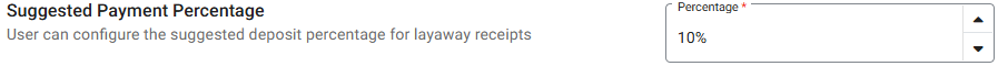 Suggested Payment Percentage - The suggested deposit percentage for layaway receipts. Enter the Percentage value or use the triangles to increase/decrease the value.