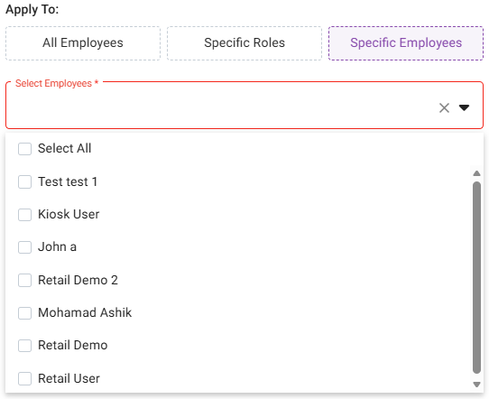Specific Employees – Select one or more Employees or Select All. Click a selected box again to deselect it.