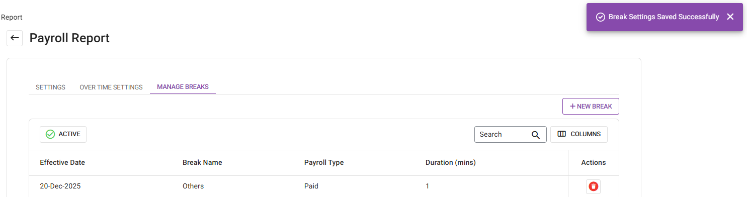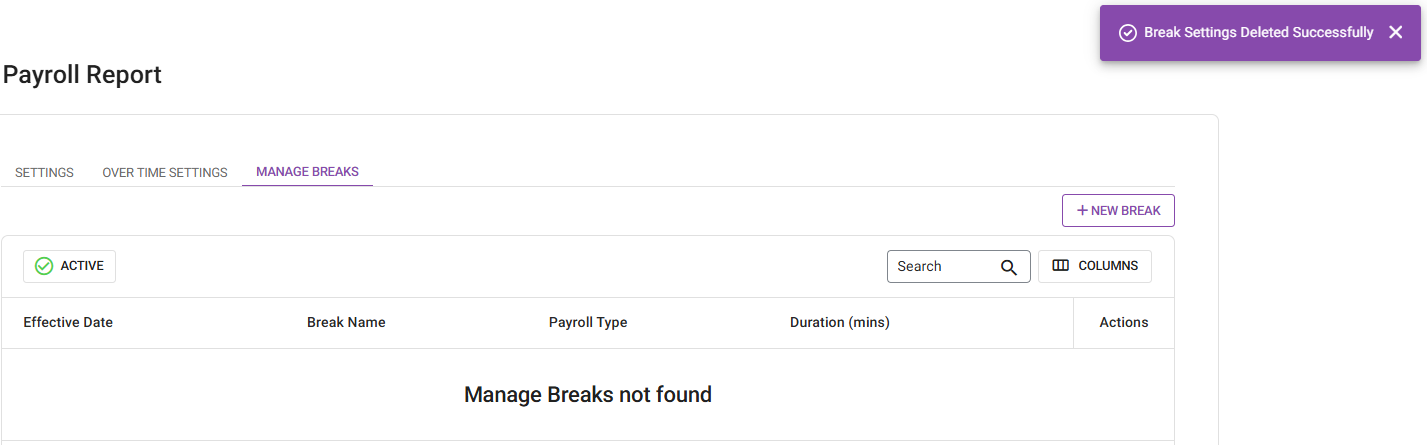 When the new Break details are set, click Save. You are returned to the main Payroll Report screen under the Manage Breaks tab. The banner ‘Break Settings Saved Successfully’ appears along with the newly-added Break.