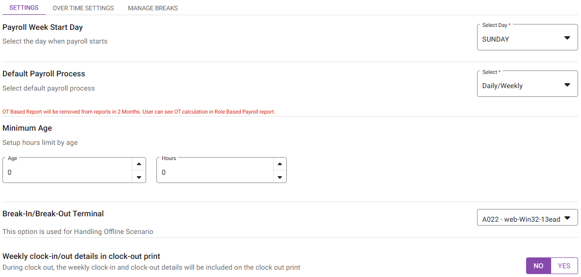 On the Payroll Report settings page, 3 tabs appear: Settings, Overtime Settings, and Manage Breaks.