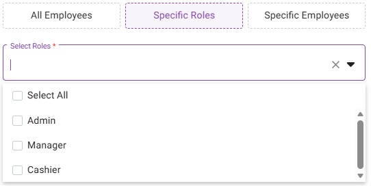Specific Roles – Select one or more Roles or Select all. Click a selected box again to deselect it.