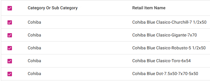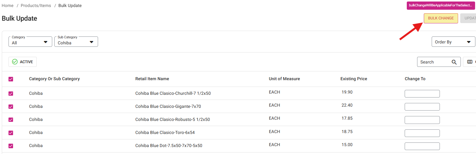 The Bulk Update page displays all the Categories/Subcategories and Retail Items created under Products/Items in table view.