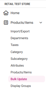 Navigation: Log into the Back Office for your Store, then select Products/Items > Bulk Update