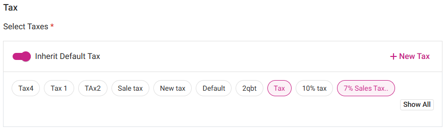 The Inherit Default Tax toggle is enabled by default and being enabled is mandatory.
