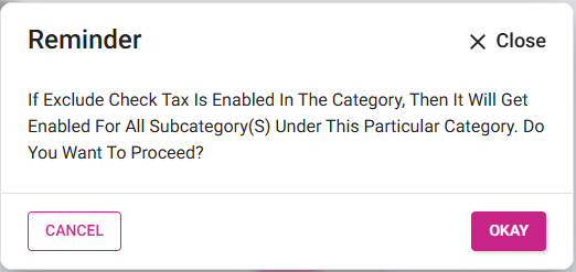 Exclude Receipt Tax - Set the toggle to YES to enable it and have the Category be excluded from a Receipt Tax. It will be disabled (NO) by default. If the toggle is changed from NO to YES (or vice versa) and the Category has Subcategories underneath it, a Reminder pop-up appears confirming that applying the change apply to all those Subcategories., with Okay and Cancel / X Close options. If Okay is clicked, the toggle change is applied. If Cancel / X Close is clicked, the toggle remains unchanged.
