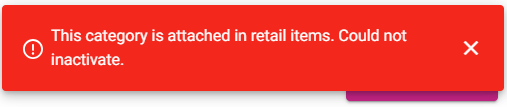 If the Category has attached Items, the message 'The category is attached in retail items. Could no inactivate.' appears and the Category remains.