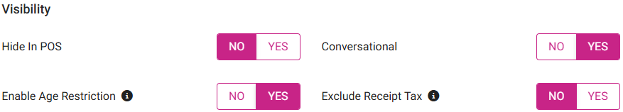 Conversational - Set the toggle to YES to enable it and have the Category appear in Conversational view in POS. It will be disabled (NO) by default.