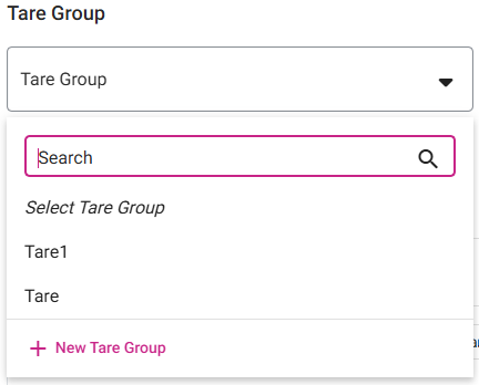Select a Tare Group from the dropdown. For a large number of Tare Groups, you can type in the Search bar to find the needed Tare Group more quickly. To create a new Tare Group, click the + New Tare Group button. For more information on Tare Groups, see the Tare Group article.
