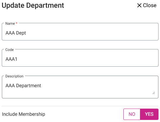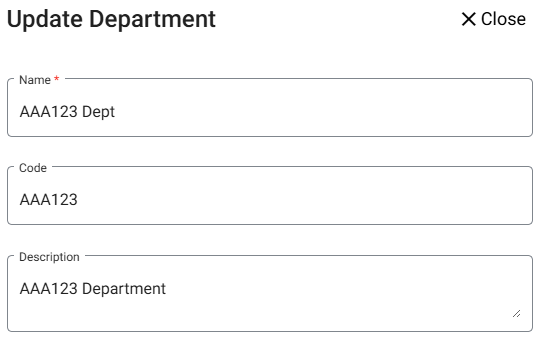 - The Update Department pane appears, which contains the information entered when the Department was created.