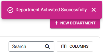 You are returned to the main Departments screen where the Department will reflect the update(s), and the 'Department Updated Successfully' confirmation pop-up appears.