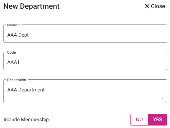 When clicked, the New Department pop up appears: