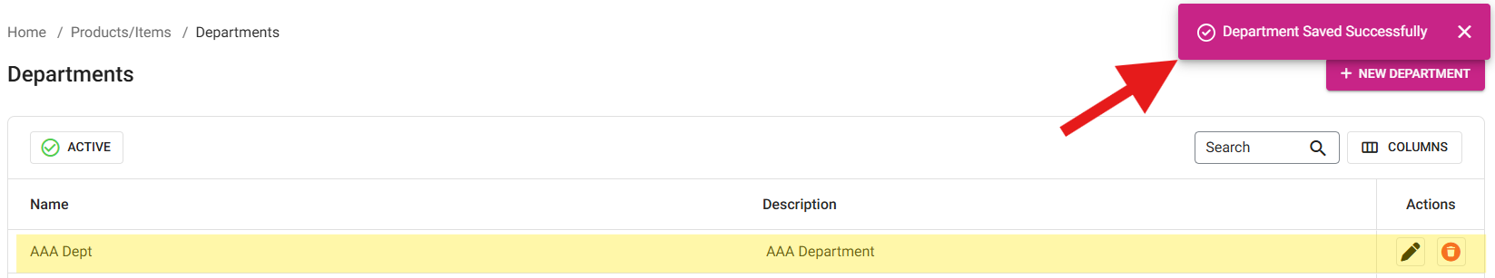 Click Save to create and save the new Department. You are returned to the main Departments screen, where the newly created Department is added as a row and the 'Department Saved Successfully' pop-up appears at the upper-right.
