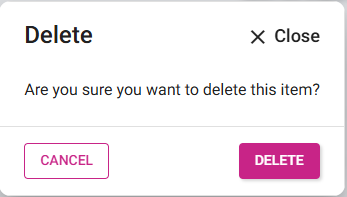On the Delete pop-up that appears, which has the message 'Are you sure you want to delete this item?' with Cancel and Delete options.