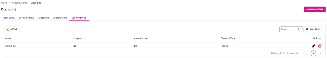 On the Discounts page, select the Mix and Match tab. It displays a table with the current Mix and Match Discounts with the columns Name, whether it has a Coupon, whether it's an Auto Discount, and the Discount Type. For Actions, you can Edit or Delete.