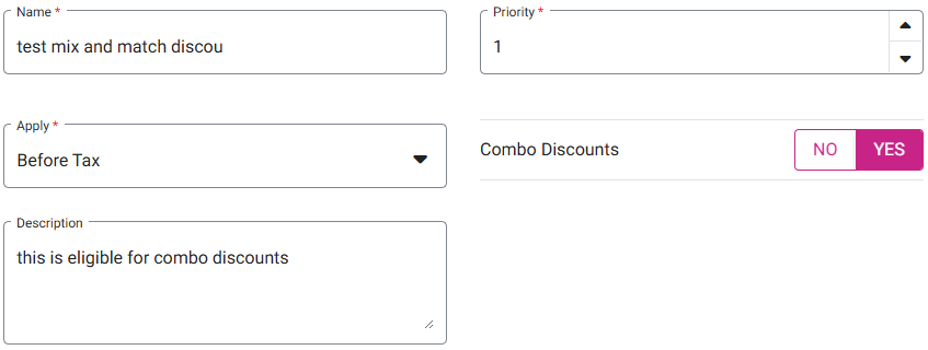 For the Combo Discounts toggle: if enabled (set to YES), enter a Description. All of the below toggles except for Combine With Other Discount will be removed.