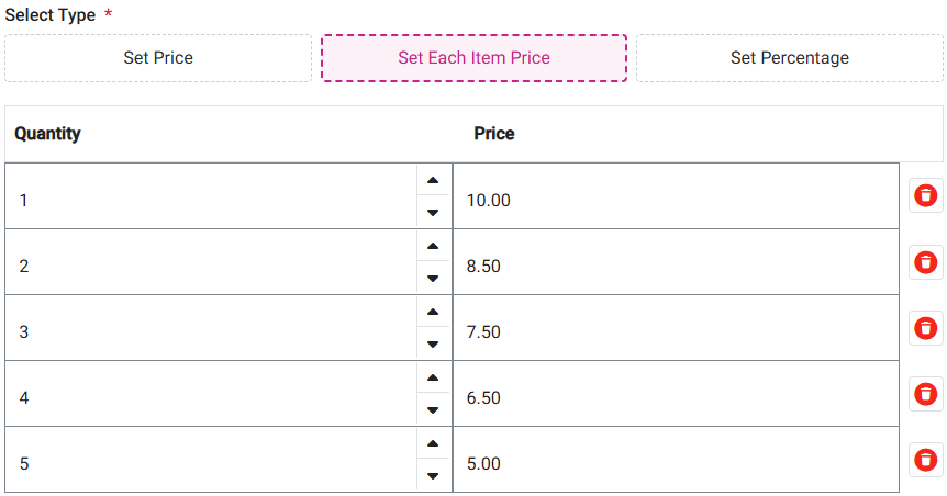 If Set Each Item Price is selected, enter the Quantity to trigger a Discount, then the Price per item.