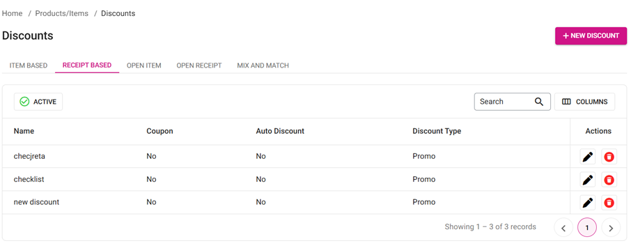 On the Discounts page, select the Receipt Based tab. It displays a table with the current Receipt-Based Discounts with the columns Name, whether it has a Coupon, whether it's an Auto Discount, and the Discount Type. For Actions, you can Edit or Delete.
