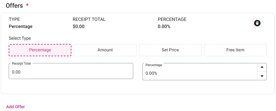 Percentage - If selected, enter the Receipt Total that will trigger the discount then the Percentage to be discounted (up to 2 decimal places).