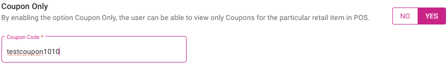 Coupon Only - If enabled (YES), enter the Coupon Code needed to apply the Discount (only letters or numbers are allowed).