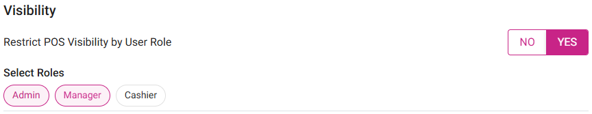 Under Visibility: the Restrict POS Visibility by User Role toggle will be disabled (NO) by default and the Discount will be available to all Roles. If enabled (YES), you must select the Role(s) that will be able to apply the Discount to a transaction. Selecting a Role causes the button to turn pink.