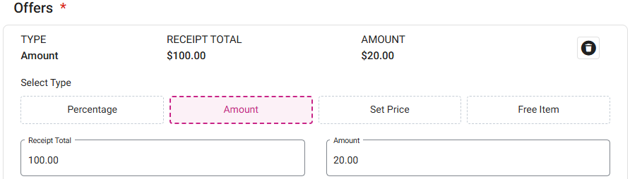 Amount - If selected, enter the Receipt Total that will trigger the discount then the Amount to be discounted (up to 2 decimal places).