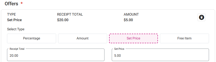 Set Price - A type of discount where a specific Set Price is the discounted price from the Receipt Total.