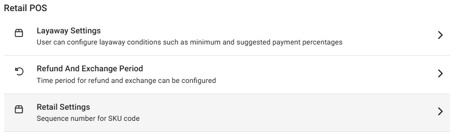 The Retail Settings page enables you to configure Automatic SKU Code Generation and allow for negative inventory.