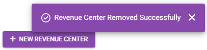 You are returned to the Revenue Center page, where the Center has been deleted and the confirmation banner appears at the upper-right.
