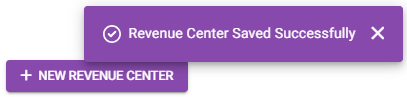 You are returned to the main Revenue Center page where a confirmation banner appears at the upper-right. If a Revenue Center was created, it will appear as a new row in the table, with the entered Name and selected Nodes.